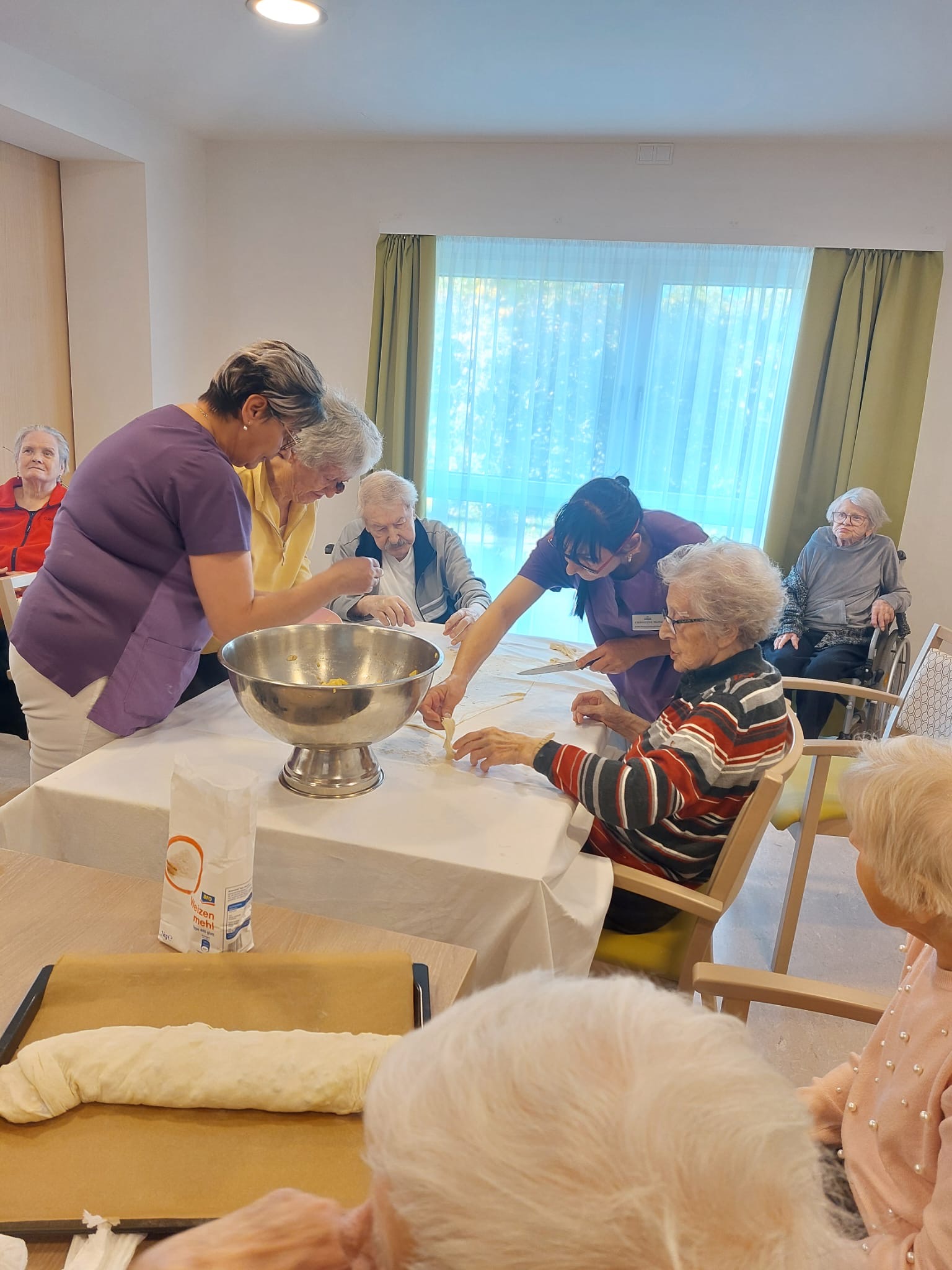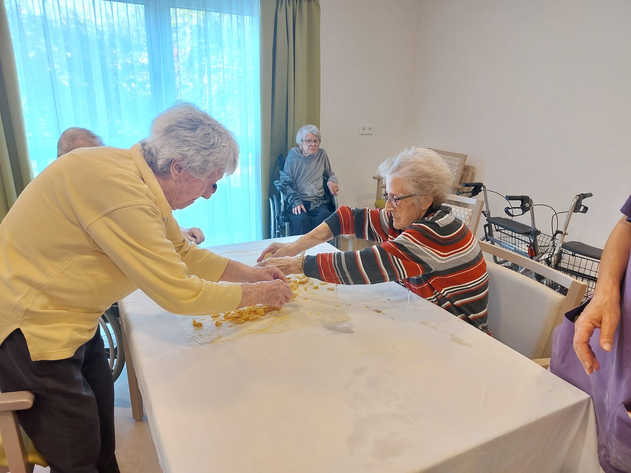 Im SeneCura Pflegezentrum Villach wurde vor Kurzem eine köstliche Backaktion gestartet, bei der die Bewohner:innen zusammen mit der Seniorenbetreuung einen leckeren Apfelstrudel zubereitet haben. Im wunderschönen Saal des Hauses haben sich alle verabredet und dort fleißig unzählige Äpfel geschält und in kleine Würfel geschnitten. Nachdem der Teig mit der herrlichen Füllung befüllt wurde, wanderte der Strudel schnell in den Backofen. Durch den süßlichen Duft, der durch das ganze Haus zog, stieg die Vorfreude auf die köstliche Nachmittagsjause immer mehr. Als der Apfelstrudel anschließend mit Staubzucker verfeinert wurde, konnte der herrliche Strudel bereits serviert werden. Die Senior:innen und Senioren genossen das Dessert in vollen Zügen und freuen sich bereits auf die nächste Backaktion.